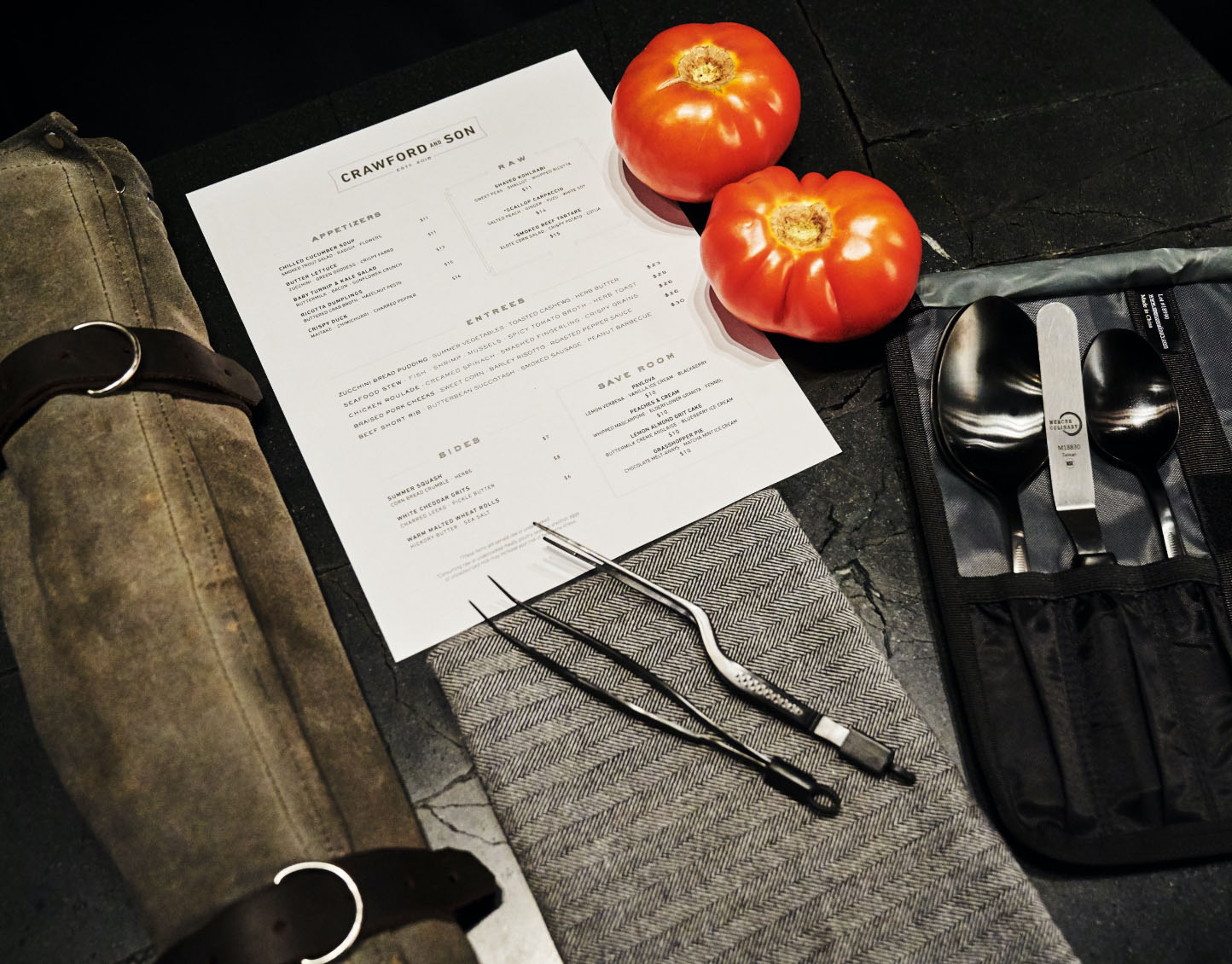 He explains his cooking inspirations, like most things, with clarity and humility. “There’s who, and there’s what for inspiration for me,” Crawford says. “The who would be the people I try to surround myself with—the smartest, most creative people I can. Often younger than me, with fresh ideas. Collaborative work is always better. The what? That’s the products, the seasonal produce, the different breeds of animals.”